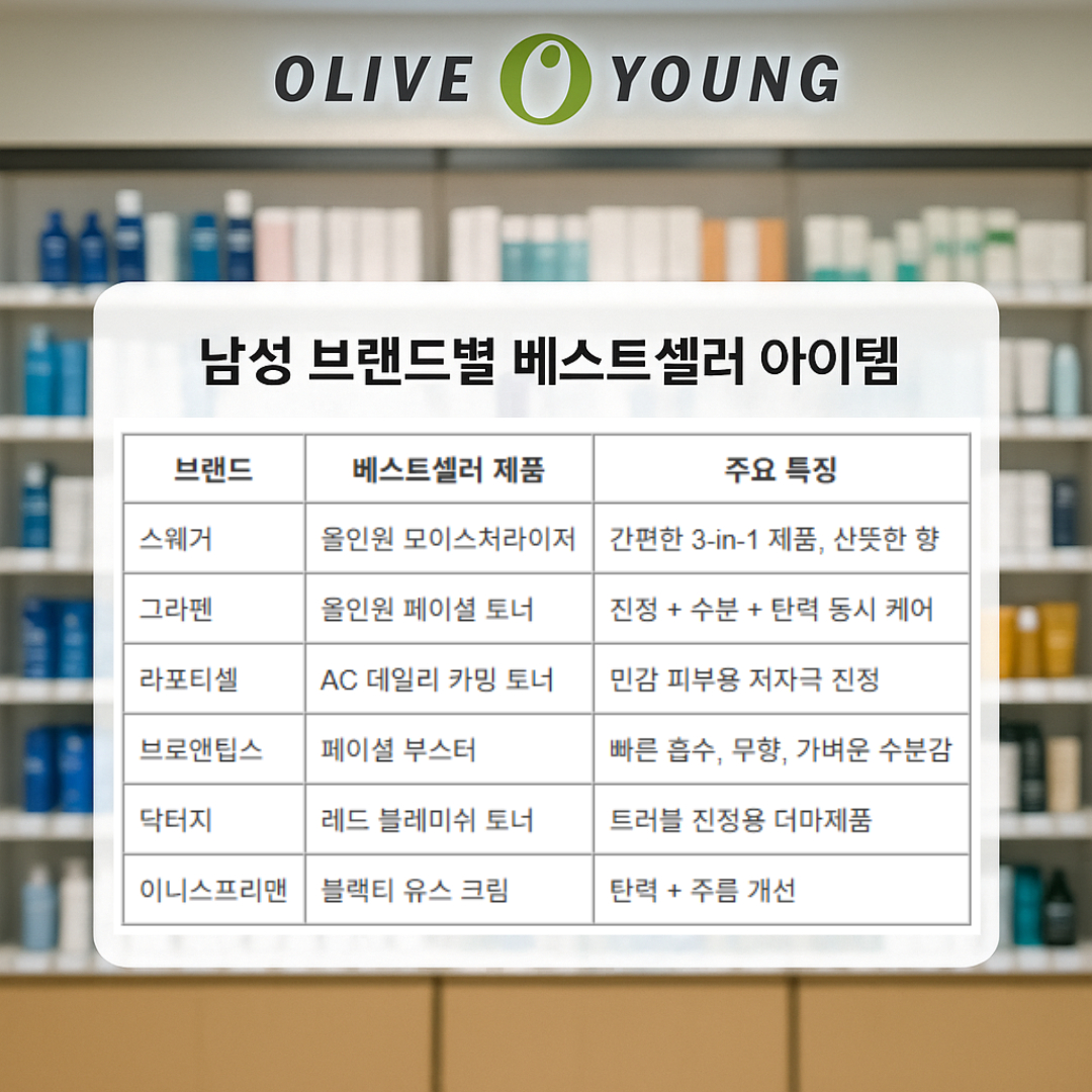 올리브영은 남성 화장품 시장에서도 다양한 브랜드와 제품을 보유하고 있습니다. 오늘은 2025년 기준, 남성들이 실제로 많이 찾는 베스트셀러 아이템을 브랜드별로 정리해 소개해드립니다. 입문자든 스킨케어 고수든, 아래 리스트만 보면 올리브영 남성 뷰티템 흐름을 한눈에 파악할 수 있습니다.